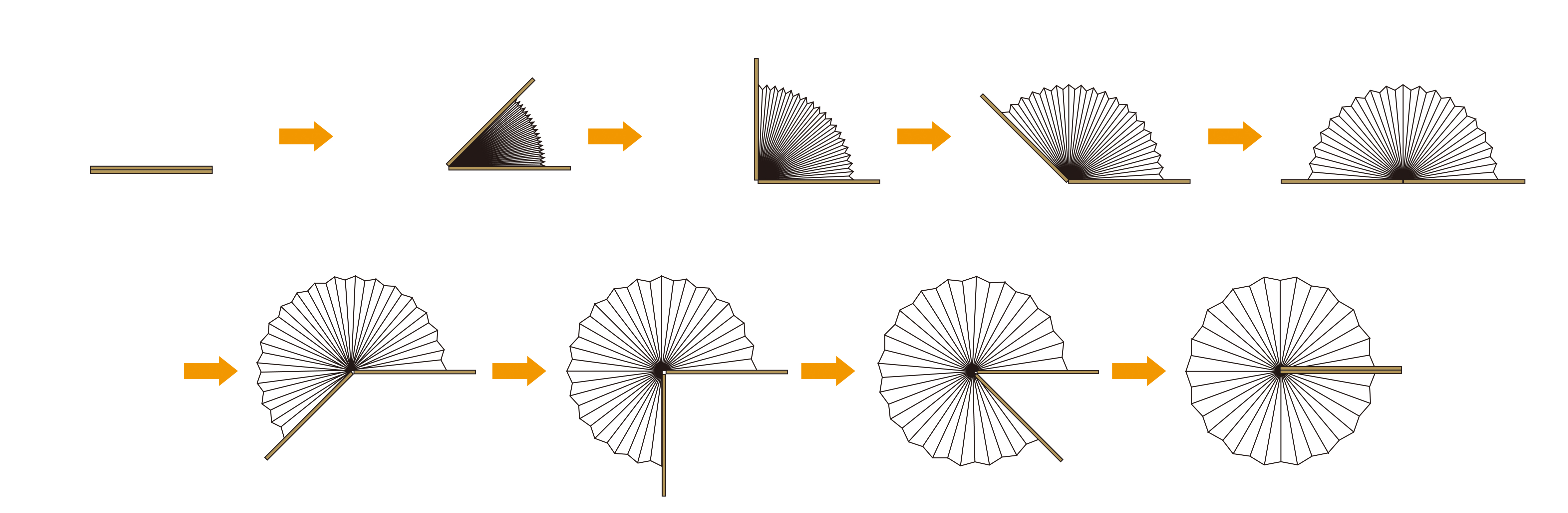 p.50〜51の図にあるように、この扇を用いることによって、0°から360°までの大きさの角をつくることができます。「開いてさまざまな大きさの角をつくる」ということに気づかせ、「回転の大きさとしての角の大きさ」について意識させるようにしましょう。半回転、一回転という用語はここで押さえさせますが、扇を開いたり閉じたりする数学的活動とともに用語を関連づけて指導しましょう。