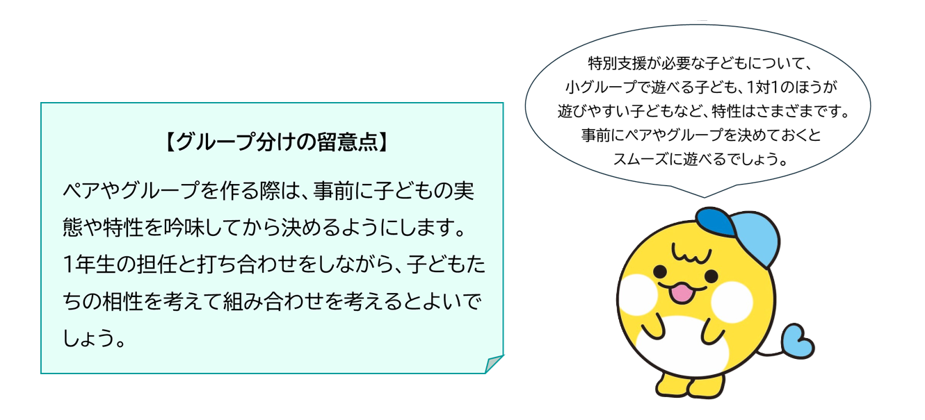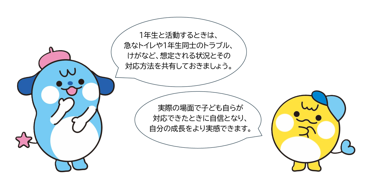 ここでは、自分たちが1年生だったときの経験をもとに、入学してきた1年生にどんな気持ちになってほしいかを考えながら、1年生を迎える会を計画したり、交流したりすることができるようにします。