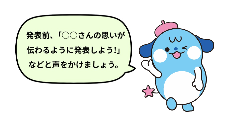 発表するとき、話す声が小さかったり、なかなか話すことができなかったりする子どもがいます。そのような子どもに対しては、励ましたり、安心させたりするような言葉をかけましょう。友だちの前で安心して話すことができる、勇気をもって発表することができる雰囲気を作れるよう配慮しましょう。