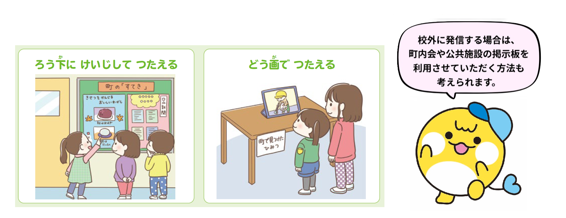 子どもたちが、発表会や交流活動を通して、町のよさや町の人と関わることの楽しさに気づくことができるようにしましょう。発表前に「招待したい人に何を伝えたいか」といった目的意識を再確認させ、自分なりのねらいや目的をしっかり持った発表になるよう支援することが大切です。