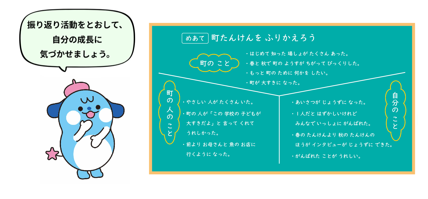 それぞれが自分の成長を確認できるように、町探検や発表会を振り返る機会を設けましょう。そこで教師や友だちからも頑張りを認められ、自身の成長を実感できると、自己肯定感が高まり、自分に自信を持つことができます。自信を持た子どもたちは、これからも自分の町に愛着を抱き、ずっと町を関わっていこうとする意欲を持つでしょう。