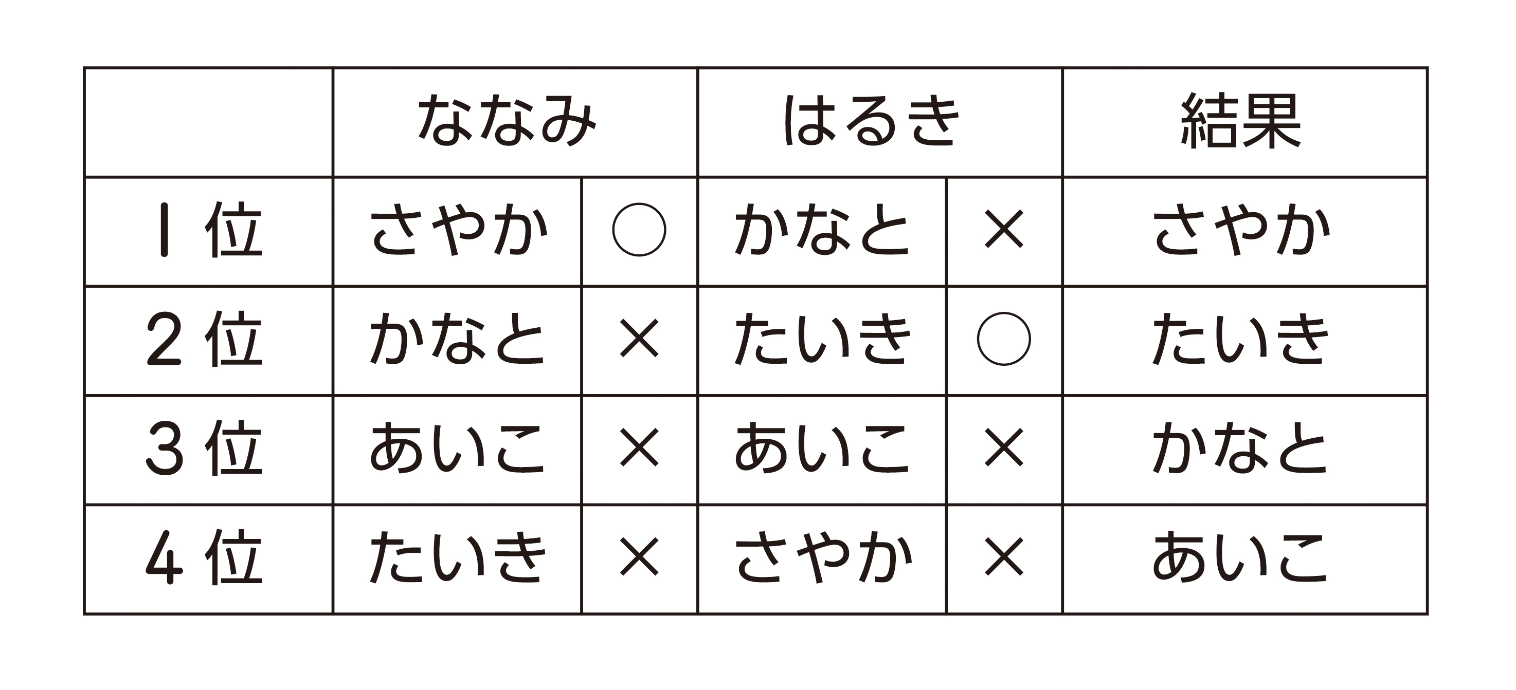 2.次に、ななみさんの予想の1位があっているとして、1位に○、他に×を入れます。そして、結果の1位にさやかさんをかきます。