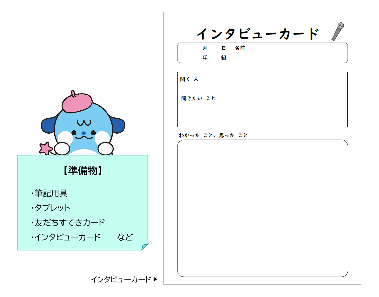 なお、インタビューの相手には、事前に教師が活動の趣旨と内容を伝え、理解を得るほか、インタビューの際には、温かい雰囲気で活動の趣旨を踏まえた回答をいただくようお願いしておきましょう。