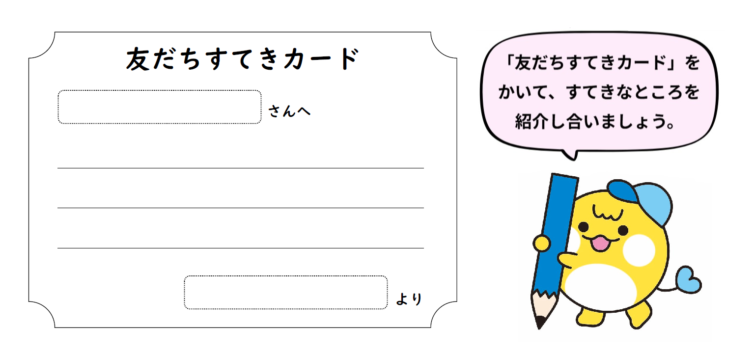 また、「友だちすてきカード」をたくさん受け取る子とそうでない子が出ることが考えられます。偏りが出ないように、「カードは同じグループの友だちに向けて書くようにする」などのルールを設定するなど配慮しましょう。