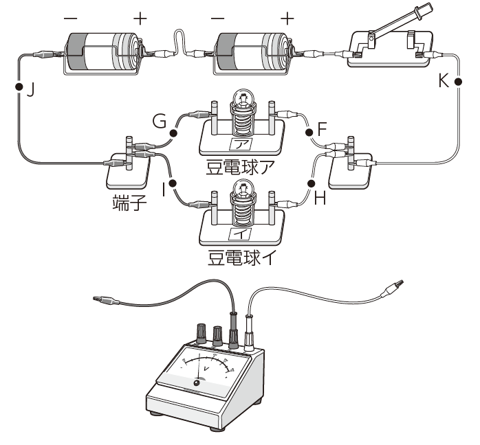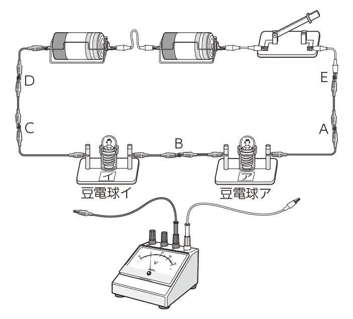 この回路において電圧をはかりたい区間に、極性を間違えないように、電圧計を並列につないでいきます。AB間、BC間、AC間などを測定させるとよいでしょう。また、AE間やCD間の電圧を測らせ、導線にはほとんど電圧が加わっていないことも見いださせます。