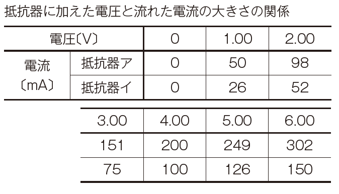 結果の表(一例)、抵抗器アは20Ω、イは40Ω