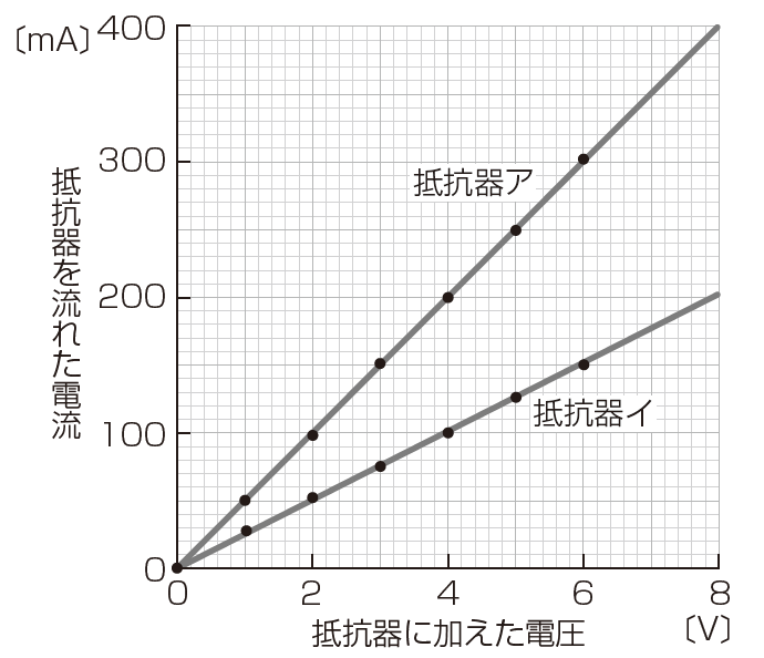 実験後、それぞれの抵抗器に加えた電圧と流れた電流の大きさの関係を表にまとめさせて次のようなグラフに図示させ、その関係を考察させましょう。
