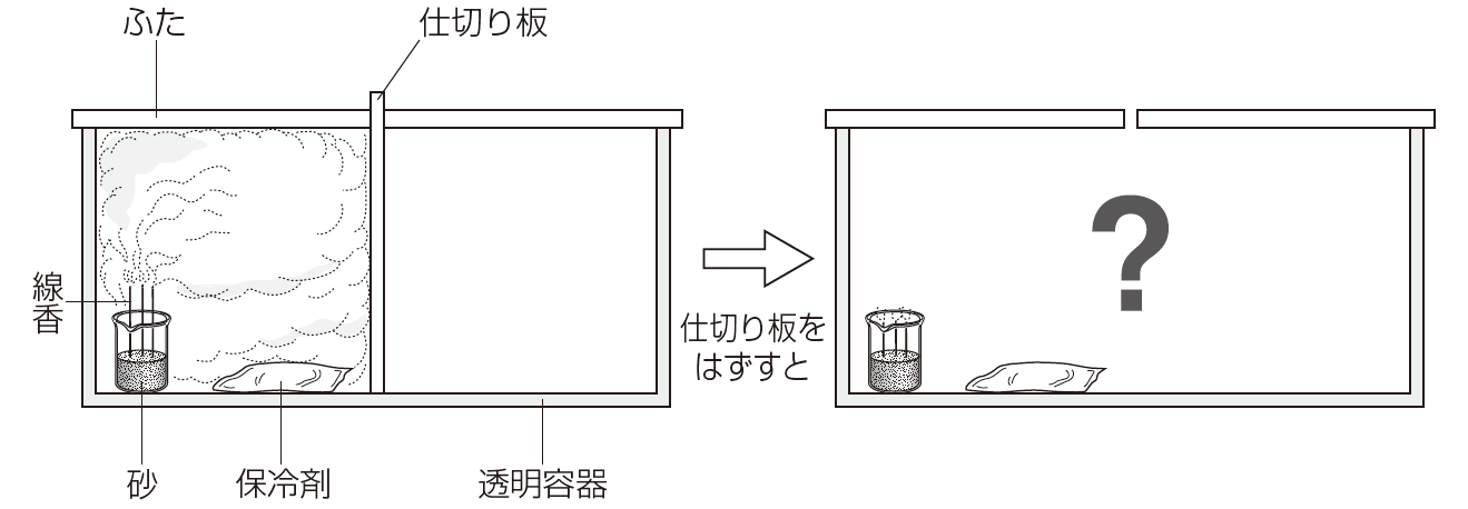 まず、透明容器の中央に仕切り板を入れ、片方に冷やした保冷剤を入れます。続いてビーカーに砂を入れ、線香を2本程度立てて火をつけます。このビーカーは透明容器の保冷剤がある側に入れ、容器にふたをします。そして、線香のけむりが充満したら、仕切り板を外します。