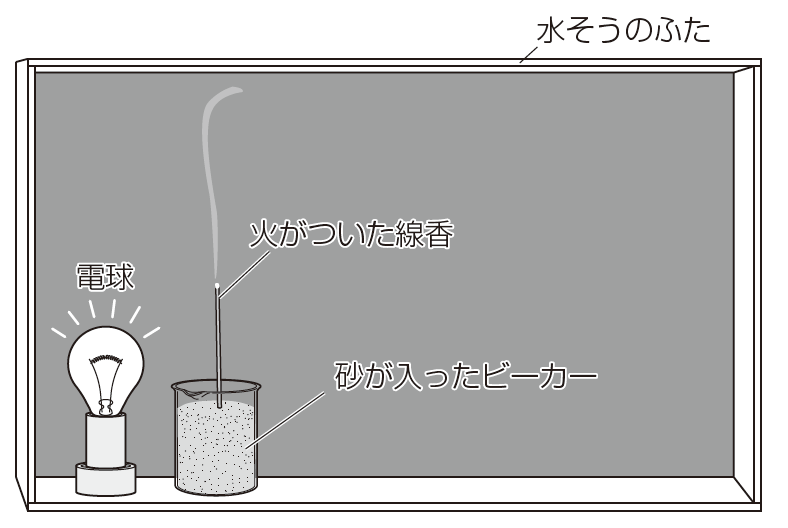 水そうの中に、火がついた線香を砂に差し込んだビーカーと電球を入れます。続いて水そうのふたを閉めて電球を点灯させ、線香のけむりの動きを見ます。
