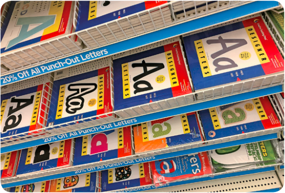 先日ニューヨークで、教員のための教材教具の専門店を訪れました。おもに小学校の先生方を対象とした品ぞろえで、かなり広い店内は教材や教具でいっぱい。各教科のドリルや参考書、指南書などが充実しているのはもちろん、教案を書くためのバインダーノート、イラストの入った名札や壁に掲示する標語ポスター、Good Job!とかGreat!と書かれたシールなど、これがあるといいな、と思うような教具がたくさんありました。写真1は、様々な字体と大きさのアルファベットの切り抜きシート各種が並んだ棚です。