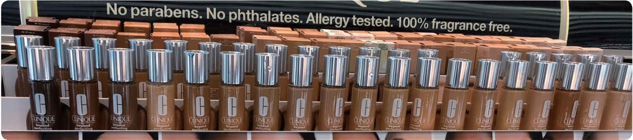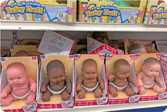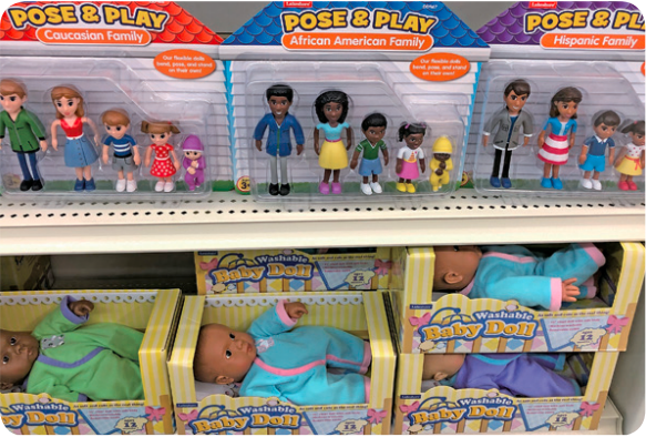 あれこれ見て回る中、赤ちゃんのお人形たちに出会いました(写真2)。様々な人種の幅広いセレクションで、肌の色だけではなく髪の質感、骨格などもそれぞれの特徴を捉えています。そして家族の人形も(写真3)、同じように様々な人種のものがあり、写真はCaucasianとAfrican AmericanとHispanicですが、ほかにもAsianやNative American が販売されていました。そして街のドラッグストアでは幅広い肌の色に対応した化粧品が、写真4のようにずらりと並んでいます。ここでは多様性を「認める」のではなく、多様性があたりまえであり、それをどう受け止めていくかに教育の力点が置かれているのだと実感しました。