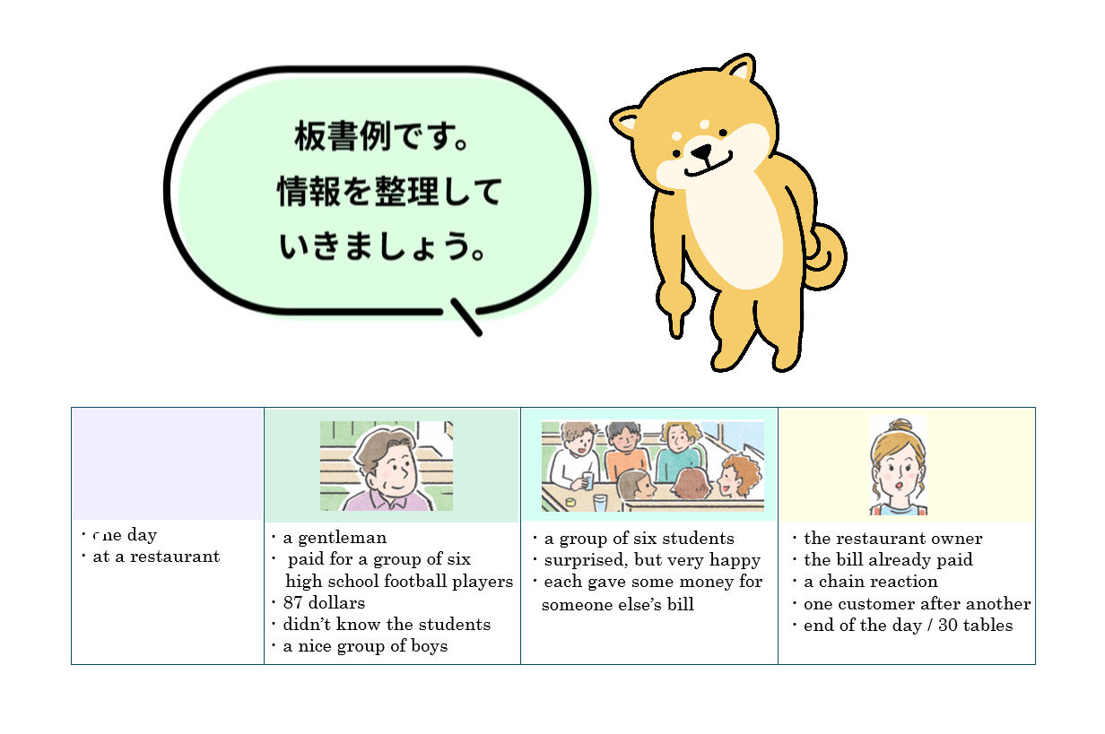 (2)ペアになり,絵と板書されたメモをもとに,話のおおまかな内容を伝え合います。ペアを替えて何回か英語で伝え合いましょう。回数を経るごとに板書した情報を消していきます。最後には板書された情報がなくなっても,話が伝えられるようにします。