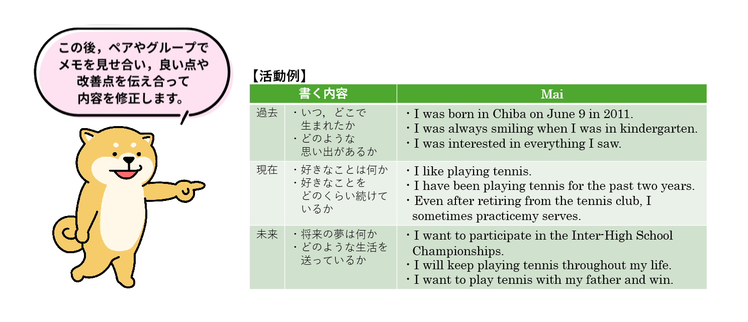 ・自分が書きたい内容についてのメモを表に書く際は,質問に答えながら英語で書くように指示しましょう。