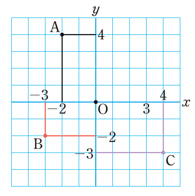 教科書p.125の例1の図では,点A,B,Cの座標を読み取りやすくするために,それぞれの点から座標軸に向かって色のついた線を引いています。