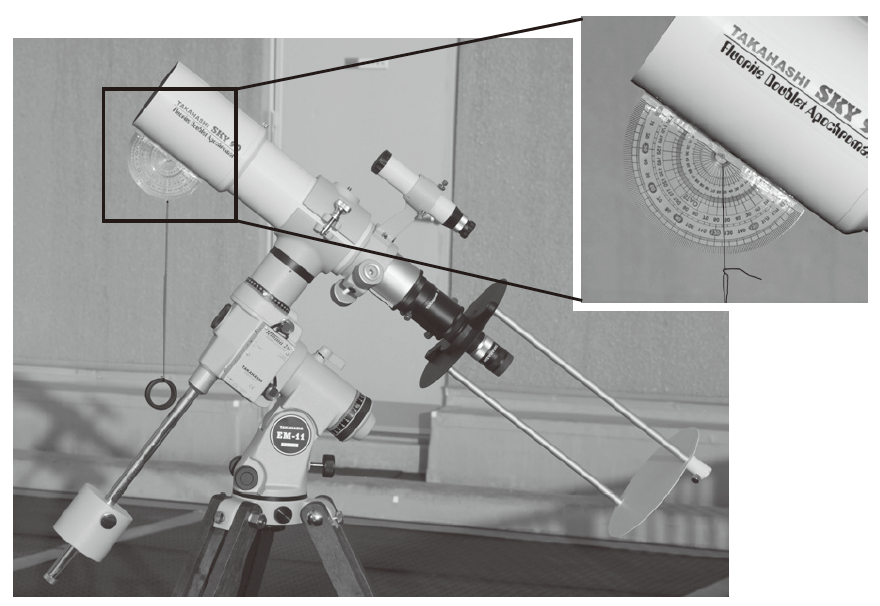 天体望遠鏡は、追尾装置のついた赤道儀式の架台を利用するとよいでしょう。はじめに、天体望遠鏡の極軸を北極星の方向に可能な限り、合わせます。次の写真のように、望遠鏡を極軸と同じ向きにして、分度器と糸、おもりを用いて、その土地の緯度と糸が示す角度(極軸の仰角)を等しくします。極軸の方向は、方位磁針が示す北の方向に合わせます。