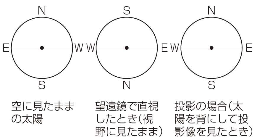 次に接眼筒を出し入れしてピントを合わせ、投影板と接眼レンズの距離を調整して、太陽像と記録用紙の円の大きさを一致させます。投影板に映る太陽像の方位については、まず、入った光は対物レンズによて一度実像になり、接眼レンズのところでは上下左右が反転して見えます。さらに接眼レンズから離れた投影板に映る像は、接眼レンズによって再度、上下左右が反転された像になります。従って、これを投影板の表側(内側)から見ると、次の図のように左右だけが反転されて見えることになります。ただし、天頂プリズムを使って鏡筒と直角に投影する望遠鏡では、さらに南北の方向も逆転するので注意しましょう。