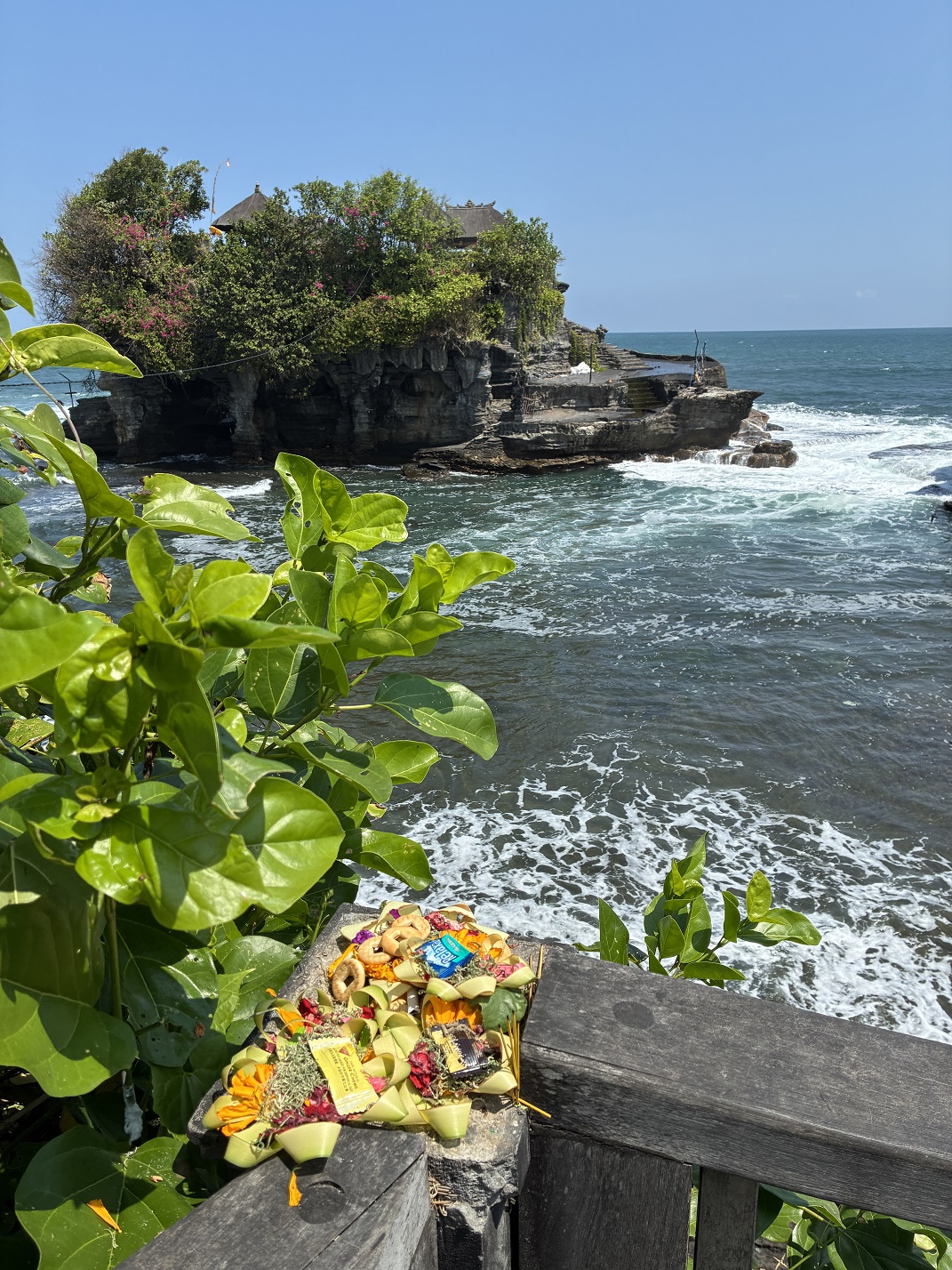 これは「チャナン」と言われるもので、バリ島で信仰されている宗教である「バリ・ヒンドゥー教」における毎日の神様へのお供え物だそうです。これには、お花やちょっとした食べ物が含まれており、「無事に生きられたことへの感謝」などの意味が込められています。タクシーの中にも置いてあったので、チャナンについて運転手に聞くと、チャナンに置いてある食べ物を野生の動物(猫・犬・鳥)などが食べにくるそうです。それは、バリ・ヒンドゥー教で動物を大切にするという教えがあるからとのことです。