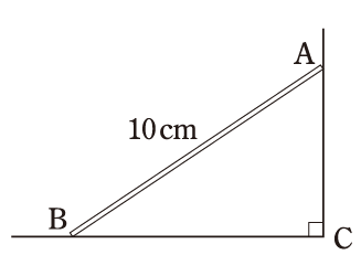 図のように,長さ10cmの棒の両端を,直角∠Cの2辺に接するように置くとき,直角三角形ABCを1通りに決めようと思ったら,どうすればよいかを考えさせます。