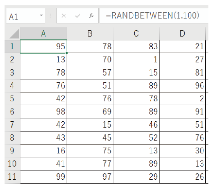 この関数を入力したセルには,( )内の2つの数値の間の整数から乱数が1つ表示されます。例えば,=RANDBETWEEN(1,100)を入力したセルには,1から100までの整数から乱数が1つ表示されます。
