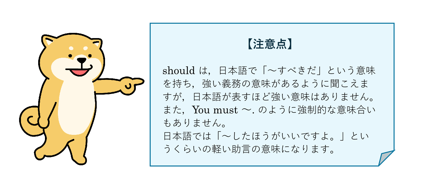 ・BはAに対する助言。助動詞 should は「〜すべきである」という義務・当然の意味を表しますが,Bのように You を主語にすると「(あなたは)〜したほうがよい」という意味になり,助言や忠告を表す機能があります。