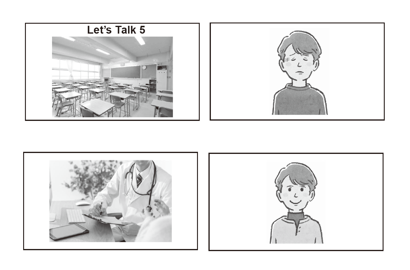 (1)まず,教師とALT が体調をたずねるやり取りをデモンストレーションします。生徒は閉本状態で,デモンストレーションを見ます。スライドを使用せず,リスニングのみで見せてもよいでしょう。