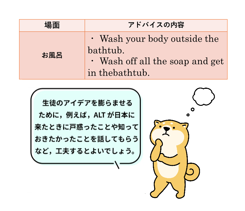 (3)オーストラリアの生徒が,自分の家にホームステイしたり,学校にやってきたりしたときのことを想像しながら,考えたアドバイスを表にメモします。その際,その理由も書けるとよいでしょう。