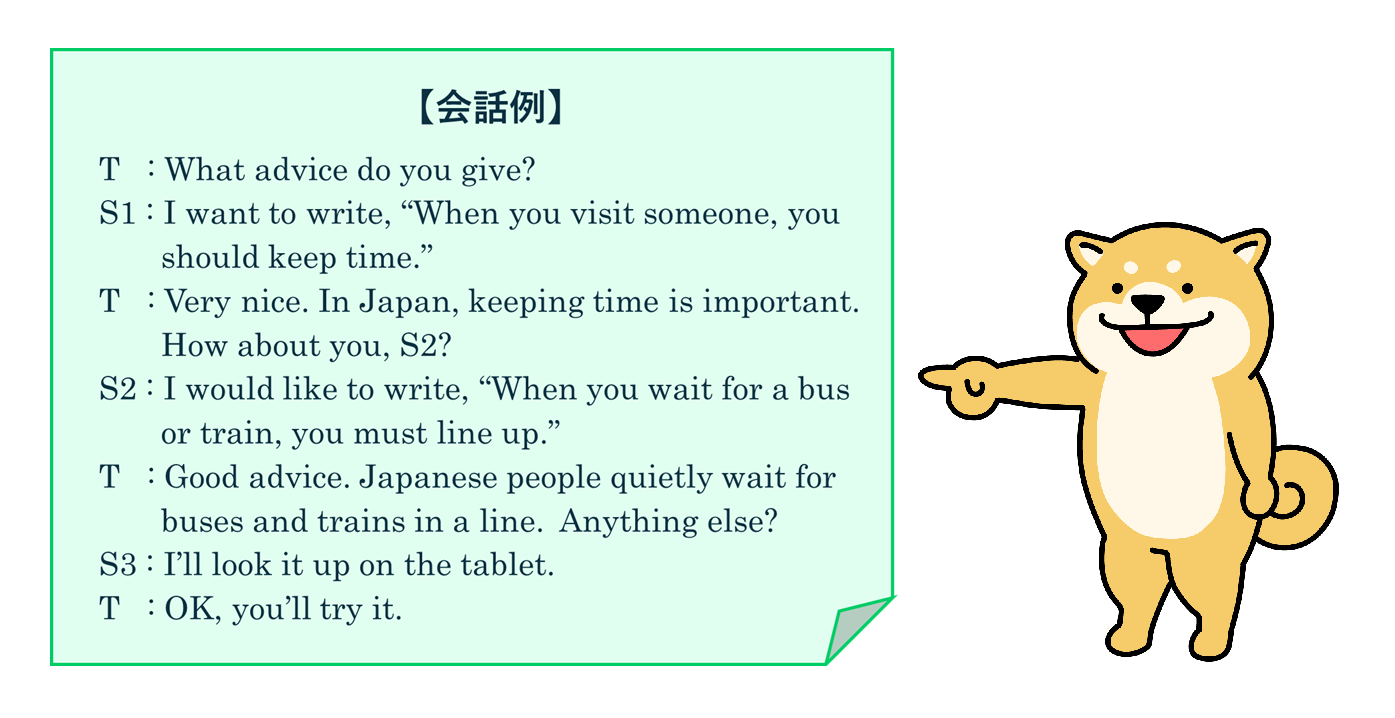 ・生徒にとって正しい英文を言うのは難しいので,教師がサポートしながら発話させたり,日本語で話させたりしましょう。