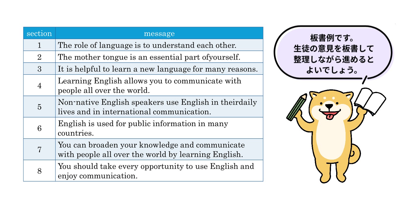各段落は,要点とその要点を支える例で書かれています。各段落の要点を1文でまとめ,それを示す例を確認することで,要点を捉えさせましょう。