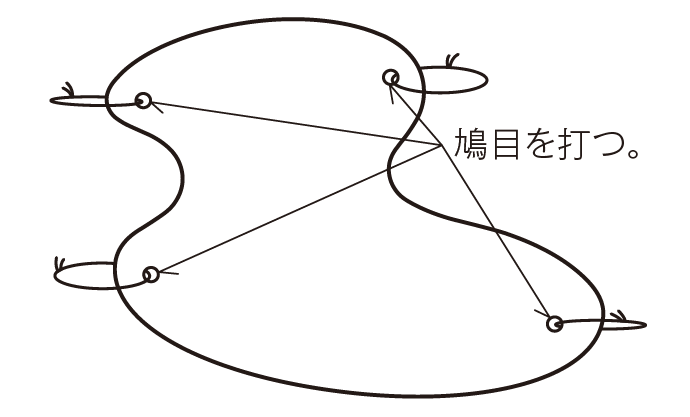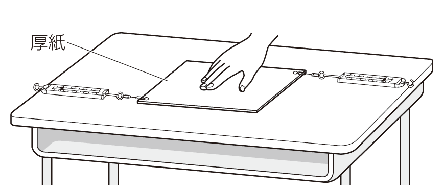 以上の実験を、穴の位置を変えて合計2〜3回測定し、このときに引く力の大きさや引く角度も変えて試すように指導します。最後に、つり合った状態で下の図のように厚紙を少し回転させてから手をはなし、厚紙の動きを観察します。