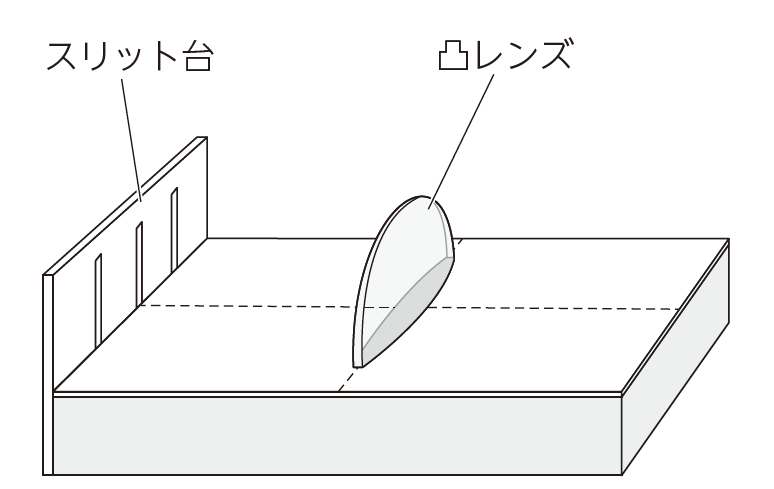 スリット台は、隙間が1mmのスリットを、約8mmの間隔で3つあけたものを用意します。隙間が広すぎると、光の干渉で道すじが不明瞭になるので注意しましょう。