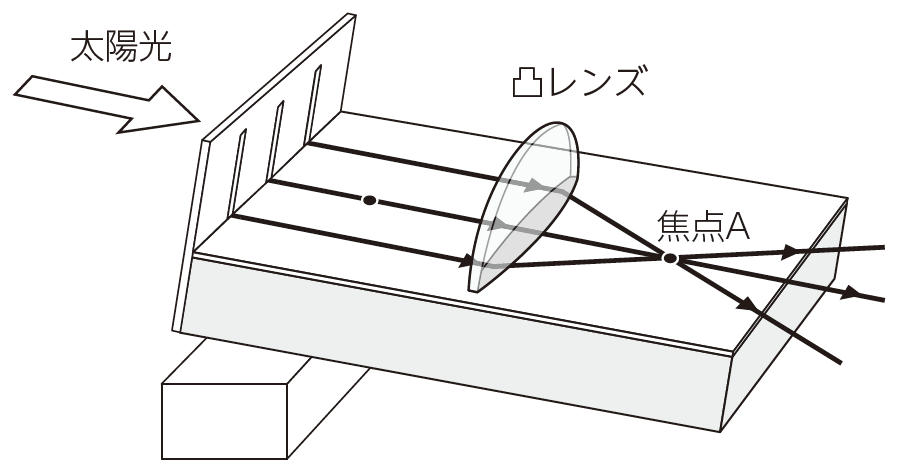 @太陽の光(平行な光)を3つのスリットから入れて、凸レンズの面に垂直に当て、光の道すじを調べます。また、太陽光の代わりに、懐中電灯(なるべく高輝度LEDがよい)を用いることもできます。その場合は、懐中電灯の先にまるい筒をつけて、平行光線になるようにずらします。