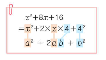 乗法の公式は,左辺と右辺を入れかえることで,因数分解に利用することができます。教科書p.22の例3は,平方の公式を利用して因数分解します。平方の公式を適用するときには,2ab に相当する中央の項を確かめる必要があります。