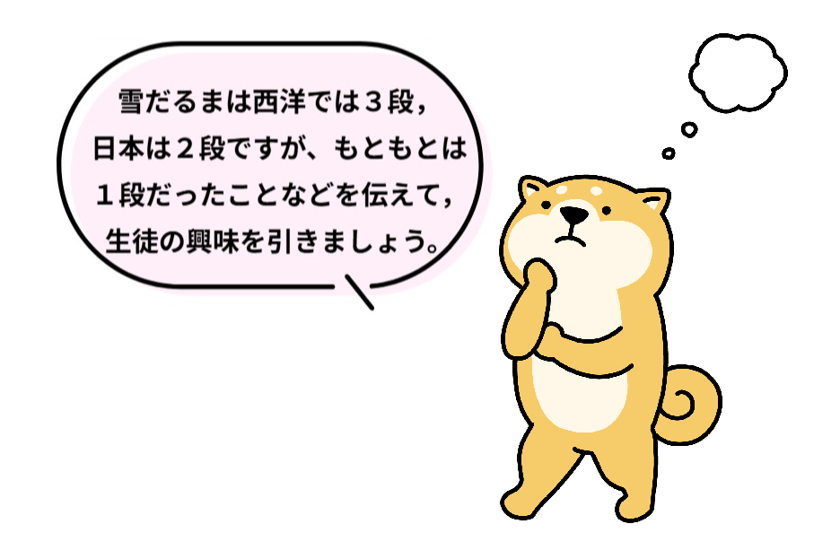 (1)導入として,雪だるまを作った経験があるか,どんな雪だるまを見たことがあるかなどについて生徒に尋ねます。雪だるまの形や,目や口や鼻にどんなものを使うかなどを共有しましょう。