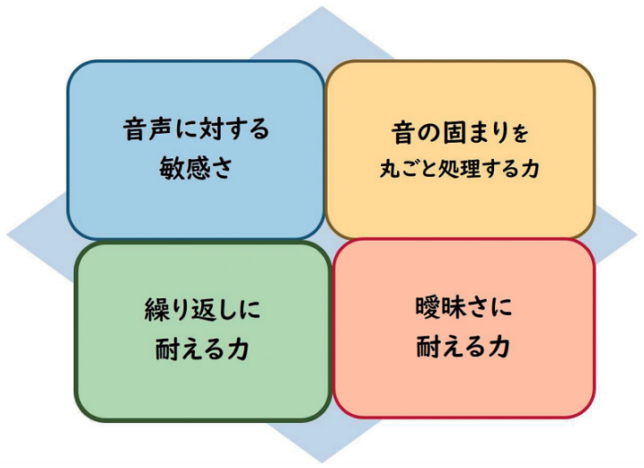 四つ目が曖昧さに耐える力(tolerance of ambiguity)です。実は子どもたちは、母語であってもわからない言葉だらけの世界に生きています。小学生にとって抽象的、概念的な語彙や、政治や経済の話など背景知識がない話題は日本語でも難しいものです。子どもたちは日々、推測し類推して、聞き流して、なんとなくわかる体験を無意識のうちに行っています。ですから、外国語が一部しかわからなくても大丈夫。これは外国語を学ぶうえで大きなアドバンテージです。わからない外国語をたくさん受けとめるという大人にとっては大いに負荷のかかる状況であっても、子どもは柔軟にその体験を受け入れ、もやもやとわからないなりに、たくさん聞いているうちに少しずつわかってくる。このような学びができる耐性が備わっていること、これはまさに児童期ならではの強みです。