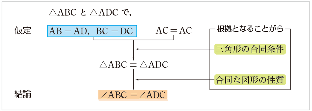 仮定から演繹的推論によって結論を導くことや,そうした考えの進め方の過程を表現することは,はじめから流暢におこなえるものではありません。生徒は,教師や教科書の表現を真似るとともに,そうした表現を通して演繹的に推論する力も伸ばすことになります。