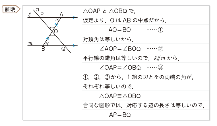 教科書p.120に証明の筋道が例示されていますが,こうした証明の筋道を書き,文章として的確に記述できるようになることが,最終的な目標といえます。ただし,証明の記述(表現)は,ただ一通りではありません。