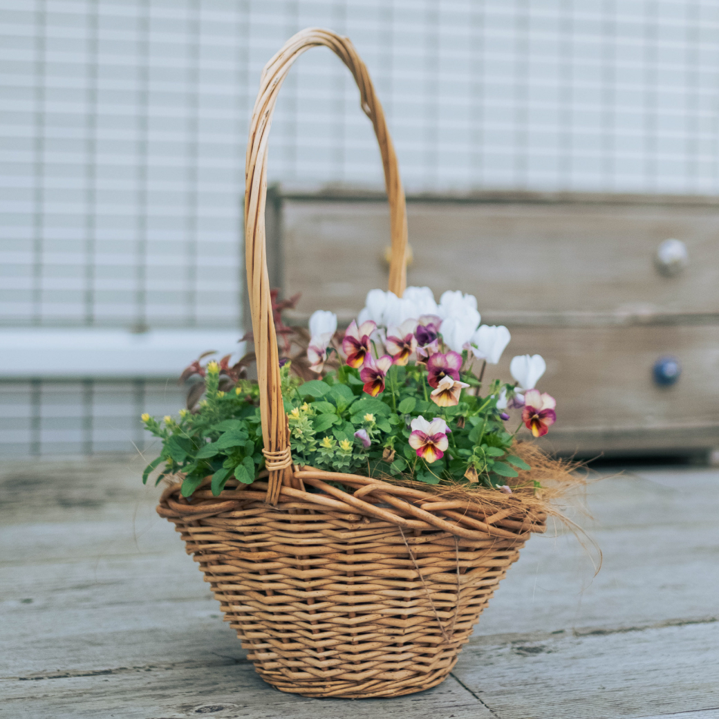 持ち手つきの柳バスケットに、ビオラなど様々な植物を組み合わせて寄せ植えする、季節感たっぷりのワークショップです。