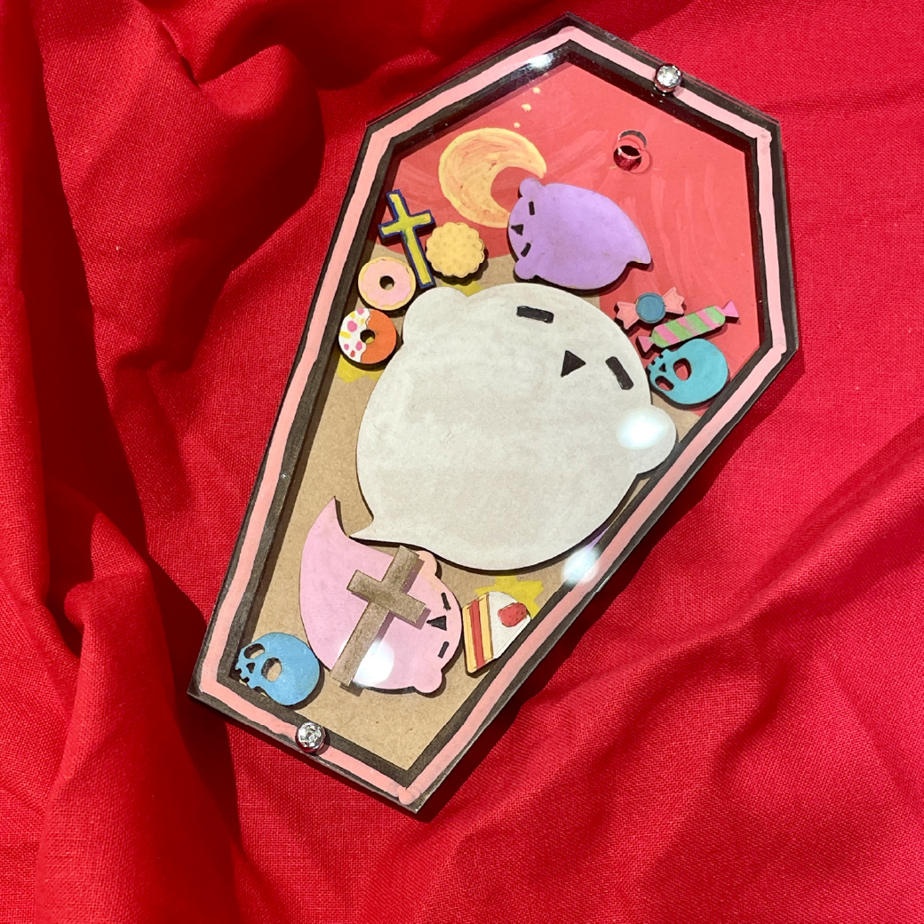 ハロウィンにぴったりなしゃかしゃかおもちゃです♪かわいいおばけたちとおかしのパーツに色を塗って、カンオケのなかにとじこめてしまいましょう!自由にお絵描きできる木製カンオケ型プレートのオマケつき。