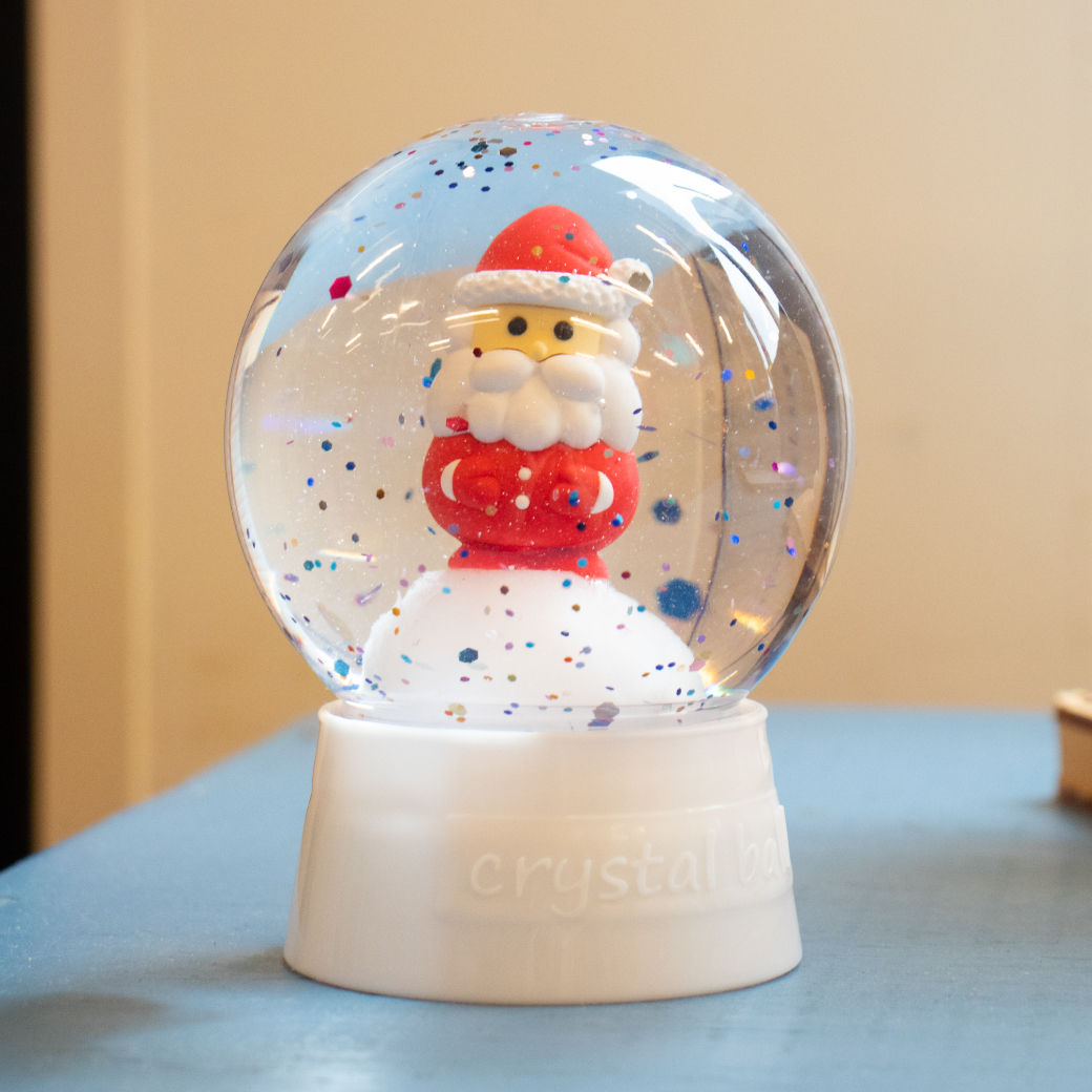 サンタさんのまわりに雪をイメージしたキラキラを入れて、冬らしい世界をとじこめます。土台部分もデコレーションできるので、自分だけのクリスマスアイテムが完成します。