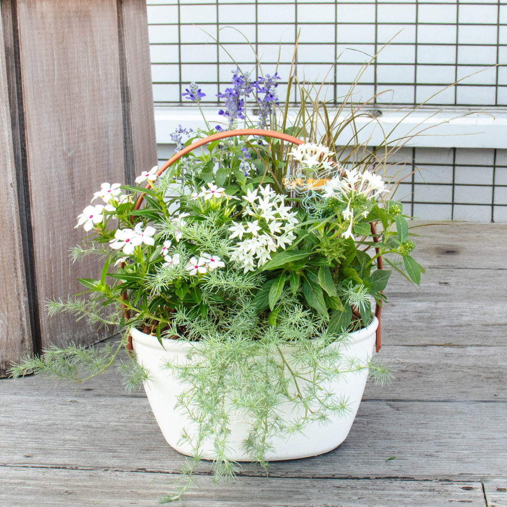 白を基調にしたやわらかな花々を集めた、寄せ植えワークショップです。